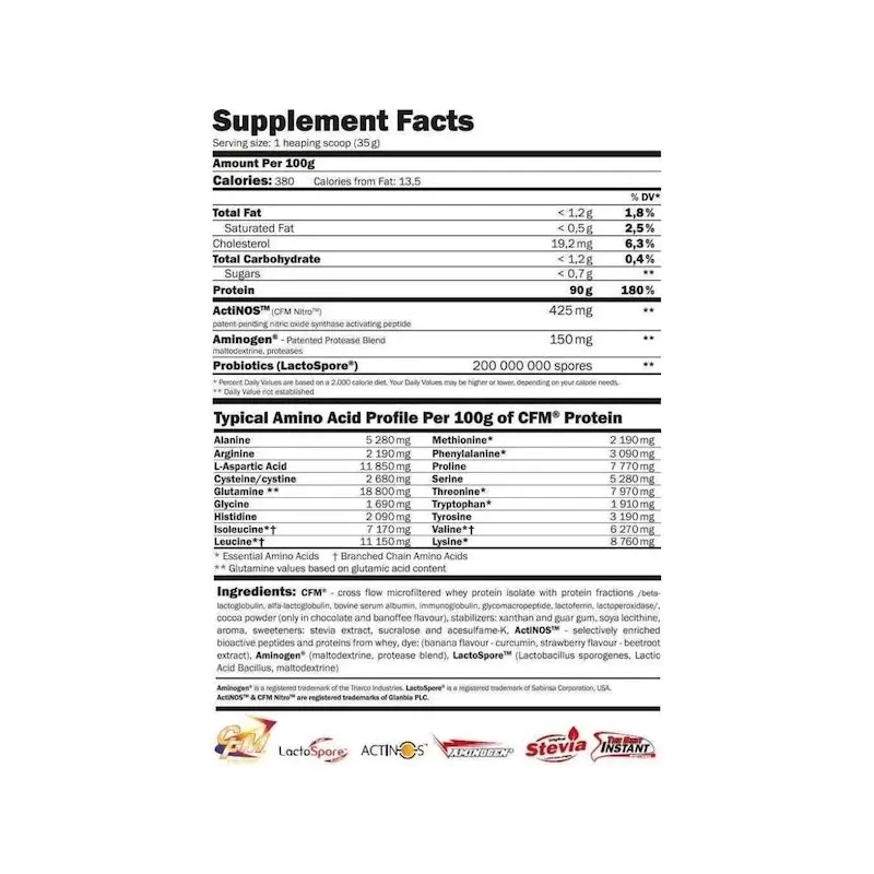 Composición Proteina CFM Nitro Whey With Actinos 2Kg | Amix Musclecore | Disponible en Nutrieliteshop