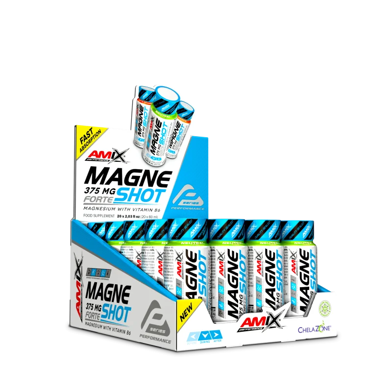 Magneshot Forte 375mg 20*60ml, de Amix Performance, es un suplemento líquido, diseñado para apoyar tus niveles de magnesio antes y durante tus entrenamientos. Cada dosis contiene 375 mg de magnesio, un mineral esencial para la función muscular y la prevención de calambres. Además, reduce la fatiga.